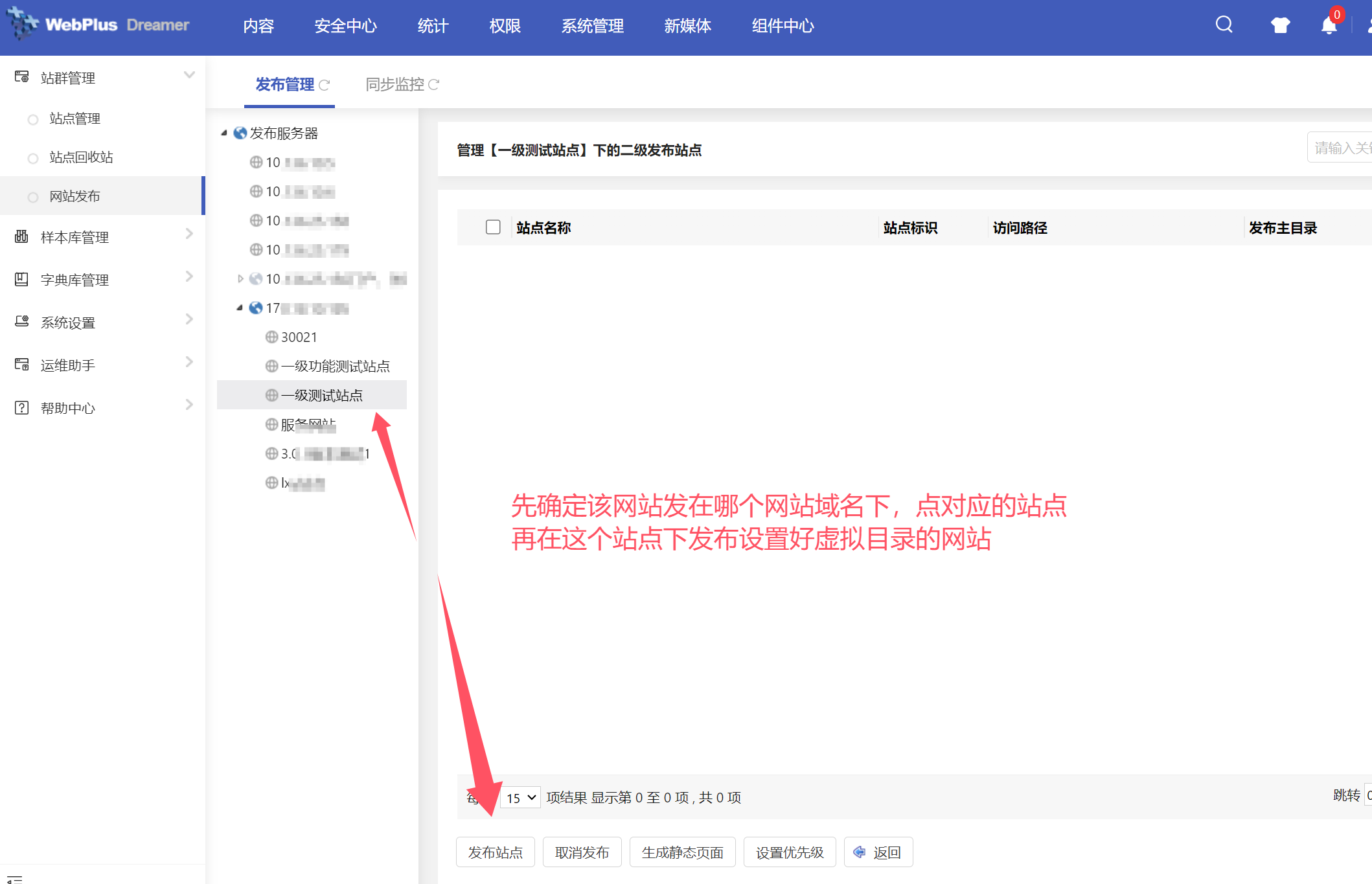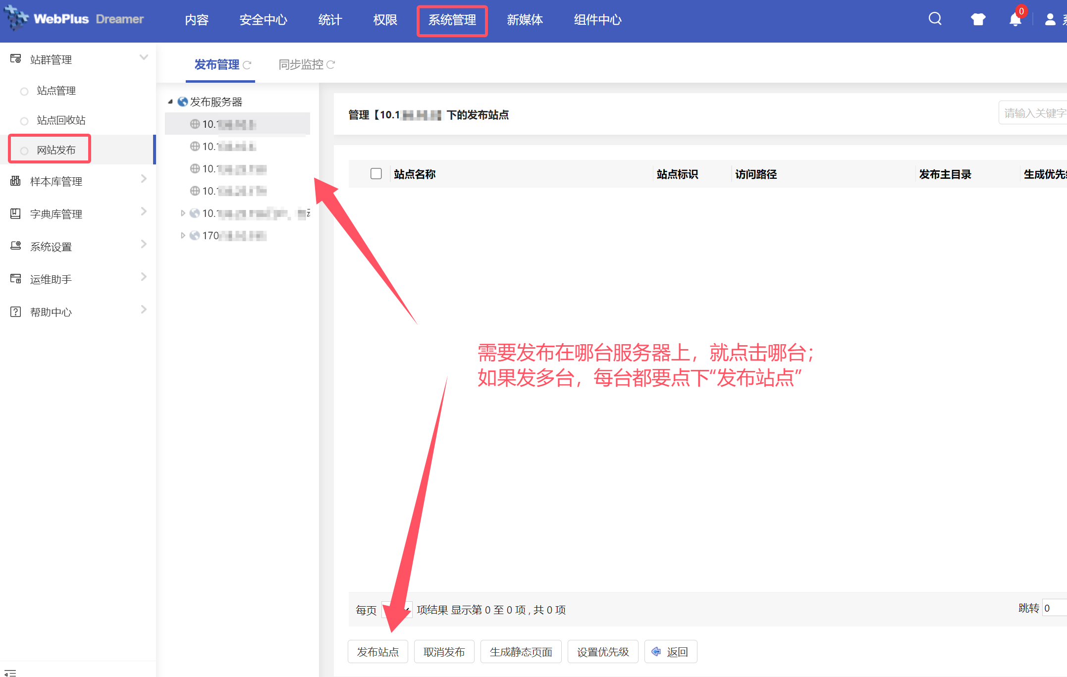 站点发布仍由系统管理员在“系统站点”中进行发布操作,【系统管理】-【站群管理】-【网站发布】,先选择发布服务器下的某个站点,点击站点名称,在该站点下,点击“发布站点”: