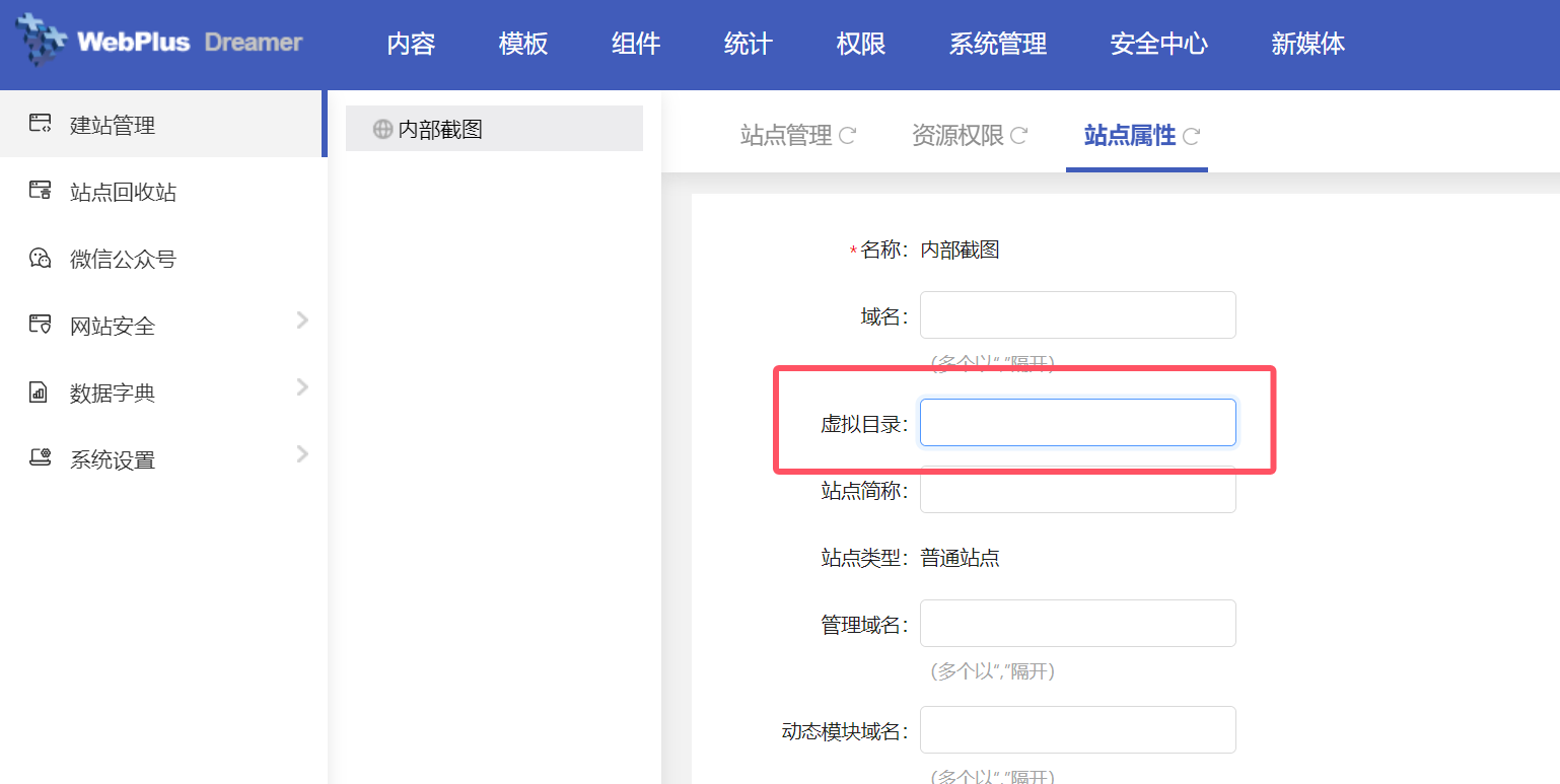 方式二:以“虚拟目录”发布网站。虚拟目录发布,就是在某个网站域名下发布该网站,访问地址为“某网站访问域名/虚拟目录”,这种方式无需进行域名解析,一般用于子网站、英文网等等。第一步操作和域名发布一致,需要在【系统管理】-【建站管理】中,修改该站点的站点属性,填写“虚拟目录”: