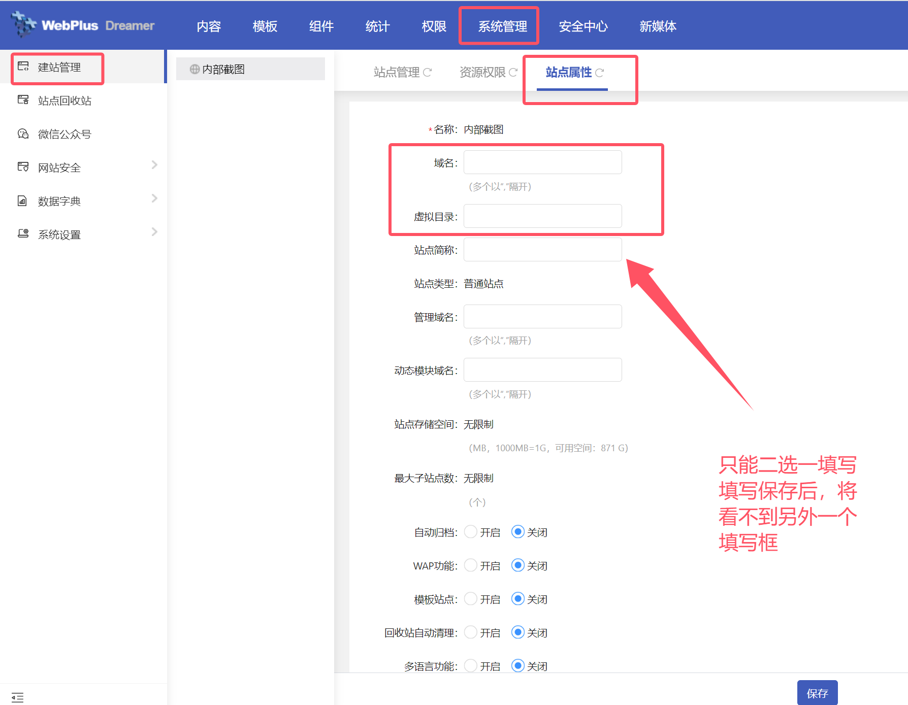 方式一:以“域名”发布网站:首先,确认好该网站后续访问的域名地址,在【系统管理】-【建站管理】中,修改该站点的站点属性,如下图位置: