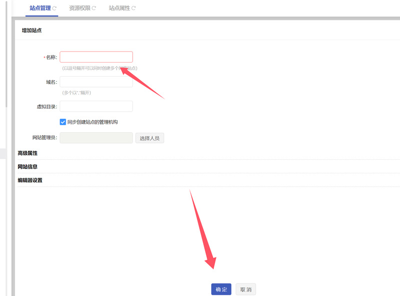 设置站点名称,点击确定: