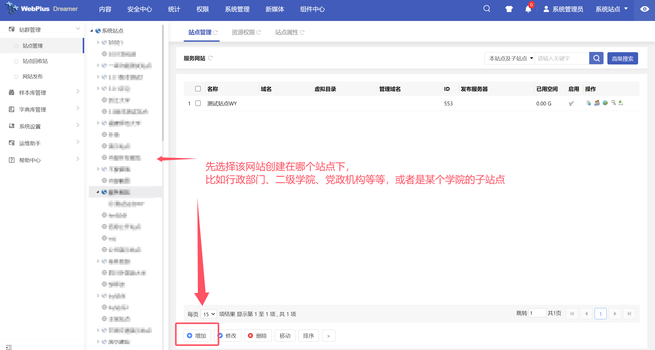 创建站点需要由网站群后台最高权限的系统管理员进行操作,在“系统站点”中,打开【系统管理】-【建站管理】-【站点管理】,选择该站点需要增加的位置,点击“增加”按钮,如图: